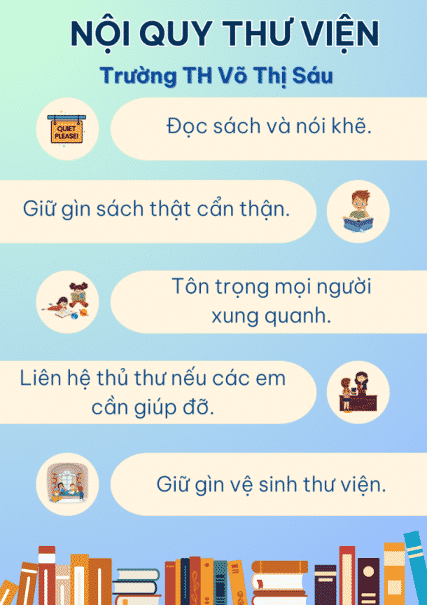 Trong thư viện của trường Tiểu học, mỗi học sinh đều phải giữ cho không gian yên tĩnh, tôn trọng sách và mọi người xung quanh. Việc trả sách đúng hạn và tình thần tự học là vô cùng quan trọng. Các em học sinh sẽ được hòa mình vào thế giới của tri thức, nơi nảy mình giữa những trang sách màu hồng và xanh, mang theo mùi của giấy in và cây viết mới mỗi khi bước chân vào.